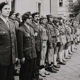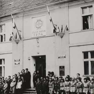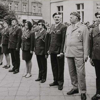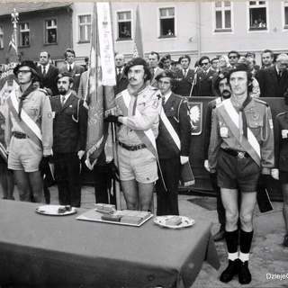 Rynek w Ostrzeszowie. Wrzesień 1974 r., zlot harcerstwa ostrzeszowskiego i uroczystość nadania hufcowi imienia SZARYCH SZEREGÓW. Druhowie od lewej: Stanisław Stawski, Semberecka (z Mikstatu), NN, Tadeusz Cudniewicz, Danuta Krysiak, Wojciech Olejniczak, Kazimierz Nalepa, Wacław Braciszewski, Józef Więckowski, Józef Michlik. Za zdjęcie dziękuję dh. Wojciechowi Olejniczakowi.