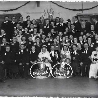 W styczniu 1947r w Ostrzeszowie odbył się ślub moich rodziców Agnieszki Heblińskiej (10) i Leona Hendrykowskiego (12) oraz siostry Leona, Zofii Hendrykowskiej (7) z Józefem Poszwą (9). Bardzo wiele osób, zwłaszcza spoza najbliższej rodziny nowożeńców, nie udało się dotąd zidentyfikować, stąd prośba o przyjrzenie się tej fotografii. Jeżeli ktokolwiek kojarzy kogoś - z innych zdjęć, dokumentów, także znajomości osobistej - to jest proszony o podzielenie się tutaj tą wiedzą, chętnie z ew. dodatkowymi uwagami, komentarzem, szczegółami... Tożsamość dzieci (8,11) też nie jest znana. Najbardziej słynny jest zapewne Mistrz Antoni Serbeński (55) Dziękuję - Wojciech Hendrykowski, Wrocław (do ew. indywidualnego kontaktuj mail: wojthen@wp.pl , tel. 600 827 407